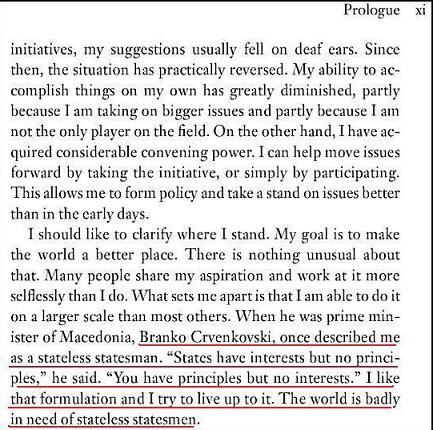Ο Μπράνκο Τσερβενκόφσκι με περιέγραψε κάποτε ως άπατρι πολιτικό άνδρα. "Τα κράτη έχουν συμφέροντα, αλλά όχι αρχές", είπε. "Εσείς έχετε αρχές αλλά όχι συμφέροντα." Μου αρέσει αυτή η διατύπωση και προσπαθώ να ανταποκριθώ σε αυτήν. Ο κόσμος χρειάζεται απελπισμένα απάτριδες πολιτικούς - τάδε έφη Τζορτζ Σόρος.