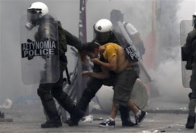| Αβοήθητος διαδηλωτής περιτριγυρισμένος από αναίσθητους Αστυνομικούς |